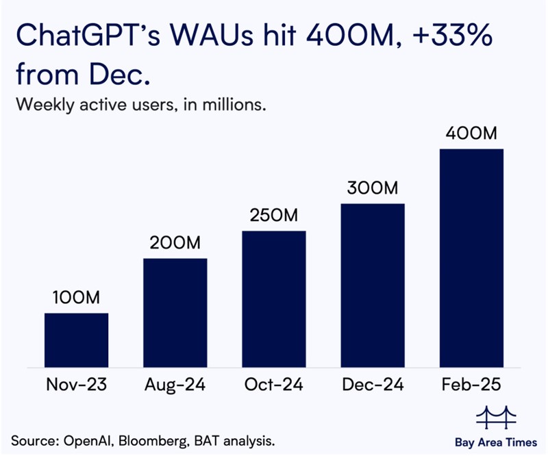 U samo dvije godine od lansiranja, 2024. godine, dosegnuo je 200 milijuna pretplatnika. Nakon toga se u samo nekoliko mjeseci broj aktivnih korisnika udvostručio. A prema OpenAI-ju, ChatGPT sada ima 400 milijuna korisnika tjedno.